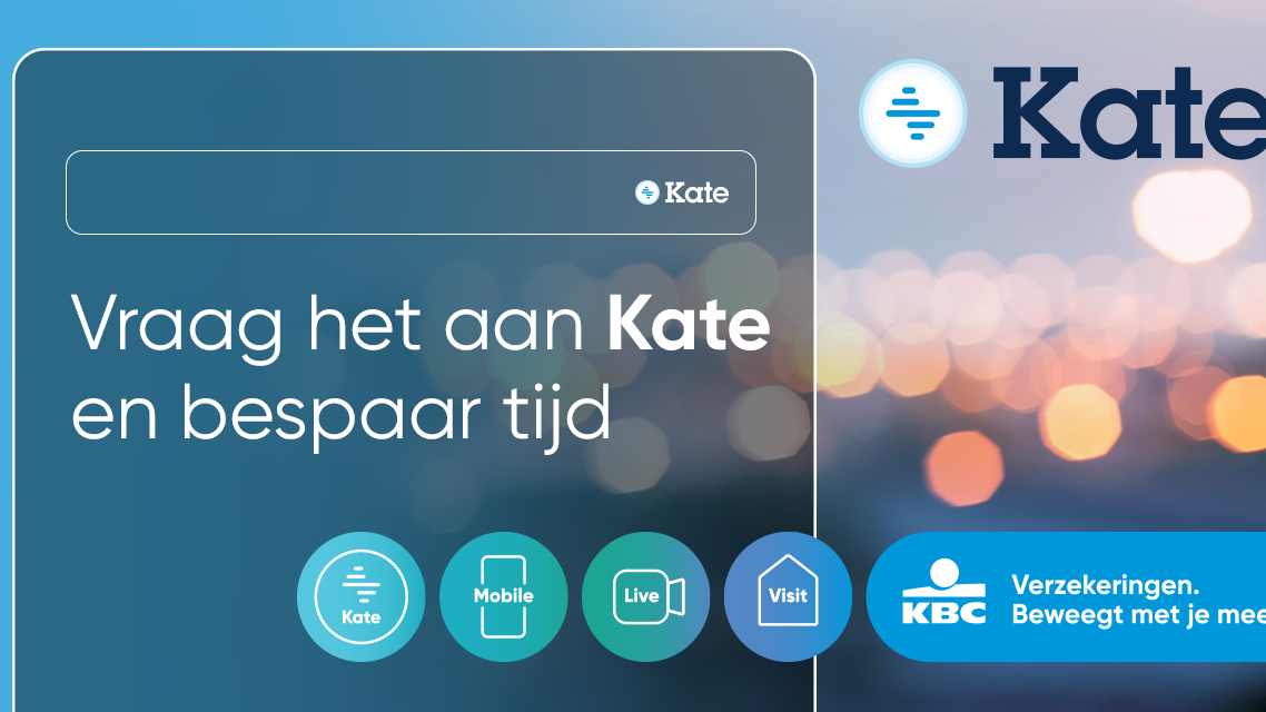 Kate is je digitale assistent die 24/7 voor je klaarstaat in KBC Mobile. Ze kan je snel helpen om je polis of verzekeringsbewijs te vinden, je verzekeringen te beheren, een nieuwe verzekering te simuleren en af te sluiten of online schade aan te geven. Voor meer complexe vragen of de afhandeling van een delicaat schadegeval kun je natuurlijk ook altijd rekenen op je vertrouwde verzekeringsagent.  Graag een afspraak met je agent? Dat kan gemakkelijk vanuit KBC Mobile.